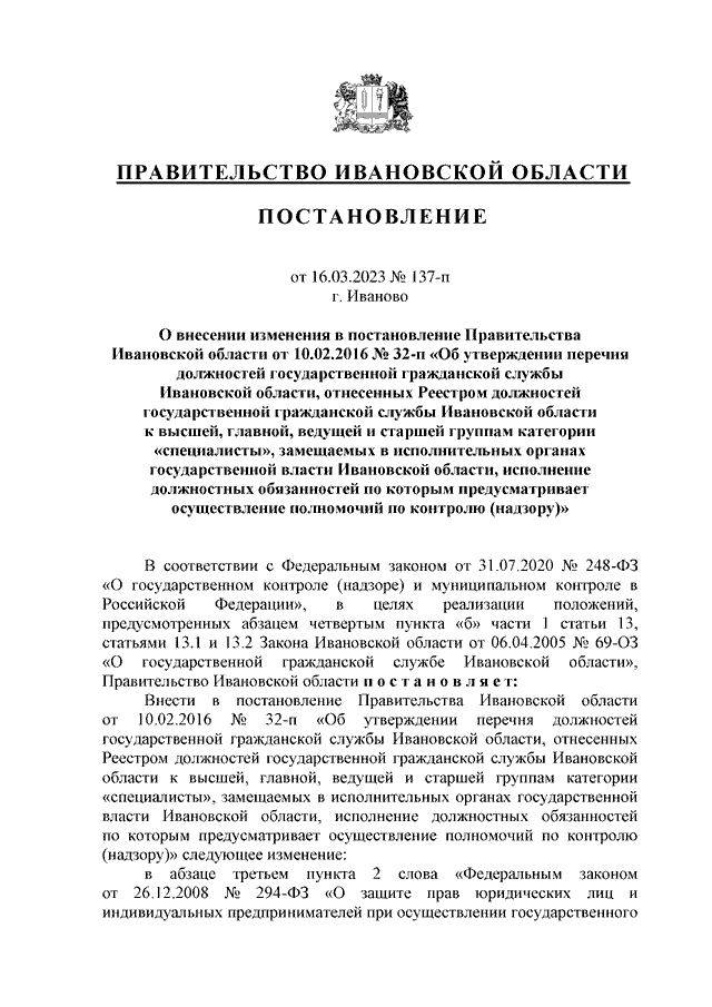 Постановление Правительства Ивановской области от 16.03.2023 N 137-п "О внесении изменения в постановление Правительства Ивановской области от 10.02.2016 N 32-п "Об утверждении перечня должностей государственной гражданской службы Ивановской области, отнесенных Реестром должностей государственной гражданской службы Ивановской области к высшей, главной, ведущей и старшей группам категории "специалисты", замещаемых в исполнительных органах государственной власти Ивановской области, исполнение должностных обязанностей по которым предусматривает осуществление полномочий по контролю (надзору)"