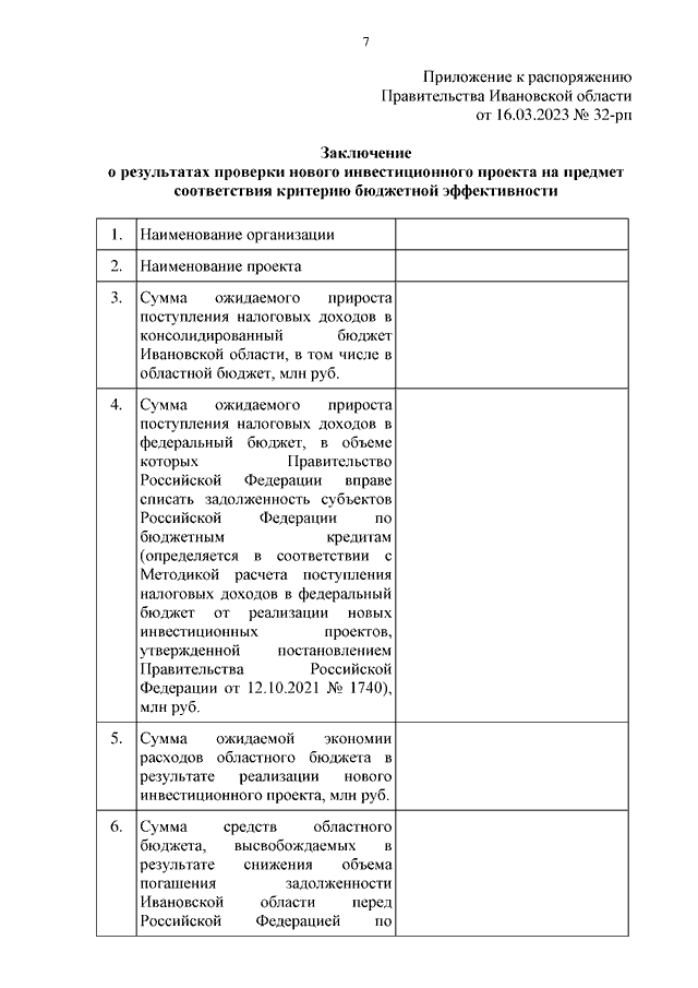 Распоряжение Правительства Ивановской области от 16.03.2023 N 32-рп "О мерах по реализации постановления Правительства Российской Федерации от 19.10.2020 N 1704 "Об утверждении Правил определения новых инвестиционных проектов, в целях реализации которых средства бюджета субъекта Российской Федерации, высвобождаемые в результате снижения объема погашения задолженности субъекта Российской Федерации перед Российской Федерацией по бюджетным кредитам, подлежат направлению на выполнение инженерных изысканий, проектирование, экспертизу проектной документации и (или) результатов инженерных изысканий, строительство, реконструкцию и ввод в эксплуатацию объектов инфраструктуры, а также на подключение (технологическое присоединение) объектов капитального строительства к сетям инженерно-технического обеспечения"