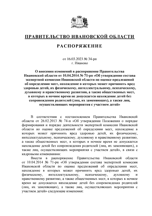 Распоряжение Правительства Ивановской области от 16.03.2023 N 34-рп "О внесении изменений в распоряжение Правительства Ивановской области от 10.04.2014 N 71-рп "Об утверждении состава экспертной комиссии Ивановской области по оценке предложений об определении мест, нахождение в которых может причинить вред здоровью детей, их физическому, интеллектуальному, психическому, духовному и нравственному развитию, а также общественных мест, в которых в ночное время не допускается нахождение детей без сопровождения родителей (лиц, их заменяющих), а также лиц, осуществляющих мероприятия с участием детей"