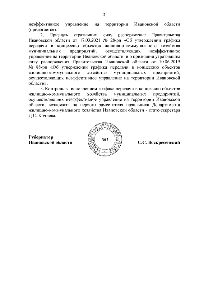 Распоряжение Правительства Ивановской области от 16.03.2023 N 36-рп "Об утверждении графика передачи в концессию объектов жилищно-коммунального хозяйства муниципальных предприятий, осуществляющих неэффективное управление на территории Ивановской области, и о признании утратившим силу распоряжения Правительства Ивановской области от 17.03.2021 N 28-рп "Об утверждении графика передачи в концессию объектов жилищно-коммунального хозяйства муниципальных предприятий, осуществляющих неэффективное управление на территории Ивановской области, и о признании утратившим силу распоряжения Правительства Ивановской области от 10.06.2019 N 88-рп "Об утверждении графика передачи в концессию объектов жилищно-коммунального хозяйства муниципальных предприятий, осуществляющих неэффективное управление на территории Ивановской области"