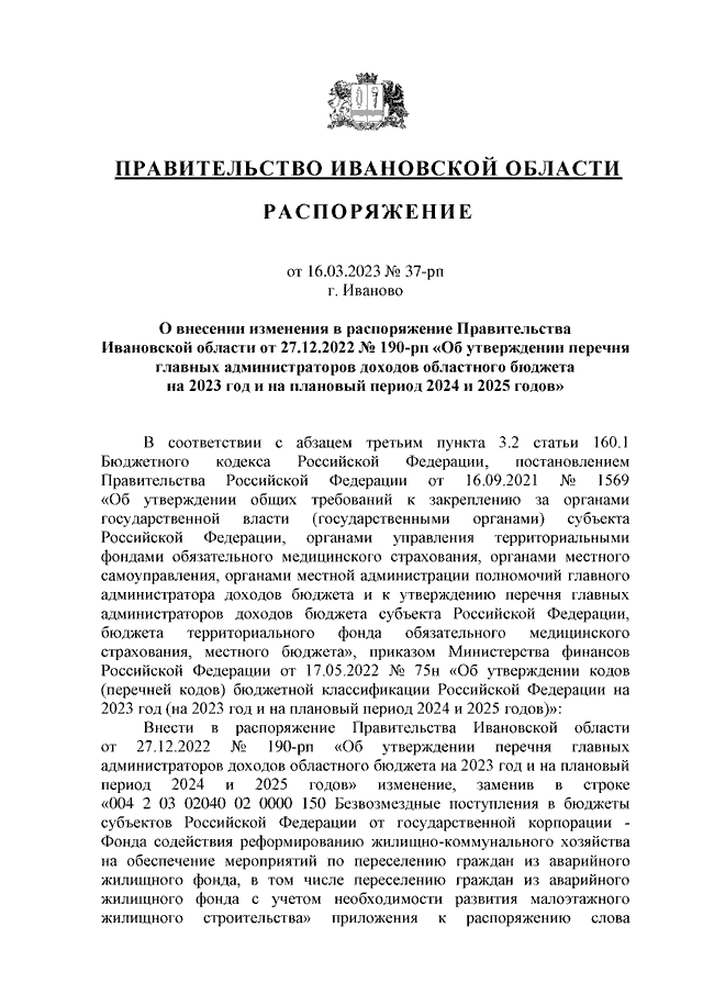 Распоряжение Правительства Ивановской области от 16.03.2023 N 37-рп "О внесении изменения в распоряжение Правительства Ивановской области от 27.12.2022 N 190-рп "Об утверждении перечня главных администраторов доходов областного бюджета на 2023 год и на плановый период 2024 и 2025 годов"