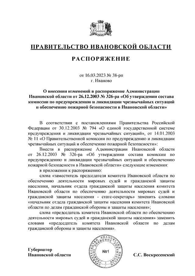 Распоряжение Правительства Ивановской области от 16.03.2023 N 38-рп "О внесении изменений в распоряжение Администрации Ивановской области от 26.12.2003 N 326-ра "Об утверждении состава комиссии по предупреждению и ликвидации чрезвычайных ситуаций и обеспечению пожарной безопасности в Ивановской области"