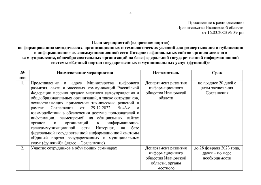 Распоряжение Правительства Ивановской области от 16.03.2023 N 39-рп "О реализации проекта по развертыванию и публикации в информационно-телекоммуникационной сети Интернет официальных сайтов органов местного самоуправления и общеобразовательных организаций на базе федеральной государственной информационной системы "Единый портал государственных и муниципальных услуг (функций)" на территории Ивановской области" (вместе с "Планом мероприятий ("дорожной картой") по формированию методических, организационных и технологических условий для развертывания и публикации в информационно-телекоммуникационной сети Интернет официальных сайтов органов местного самоуправления, общеобразовательных организаций на базе федеральной государственной информационной системы "Единый портал государственных и муниципальных услуг (функций)")