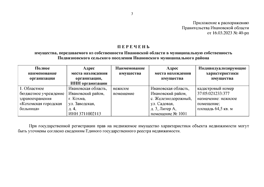 Распоряжение Правительства Ивановской области от 16.03.2023 N 40-рп "О передаче имущества из собственности Ивановской области в муниципальную собственность Подвязновского сельского поселения Ивановского муниципального района"