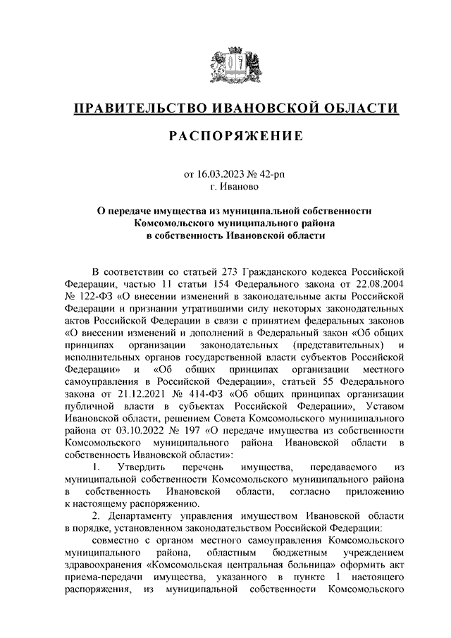 Распоряжение Правительства Ивановской области от 16.03.2023 N 42-рп "О передаче имущества из муниципальной собственности Комсомольского муниципального района в собственность Ивановской области"
