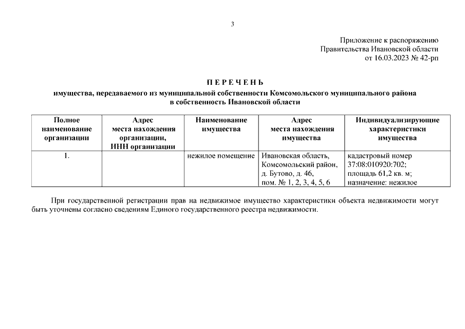 Распоряжение Правительства Ивановской области от 16.03.2023 N 42-рп "О передаче имущества из муниципальной собственности Комсомольского муниципального района в собственность Ивановской области"
