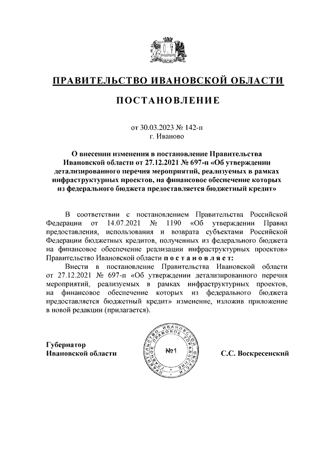 Постановление Правительства Ивановской области от 30.03.2023 N 142-п "О внесении изменения в постановление Правительства Ивановской области от 27.12.2021 N 697-п "Об утверждении детализированного перечня мероприятий, реализуемых в рамках инфраструктурных проектов, на финансовое обеспечение которых из федерального бюджета предоставляется бюджетный кредит"