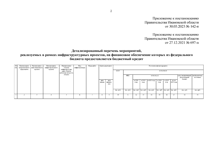 Постановление Правительства Ивановской области от 30.03.2023 N 142-п "О внесении изменения в постановление Правительства Ивановской области от 27.12.2021 N 697-п "Об утверждении детализированного перечня мероприятий, реализуемых в рамках инфраструктурных проектов, на финансовое обеспечение которых из федерального бюджета предоставляется бюджетный кредит"