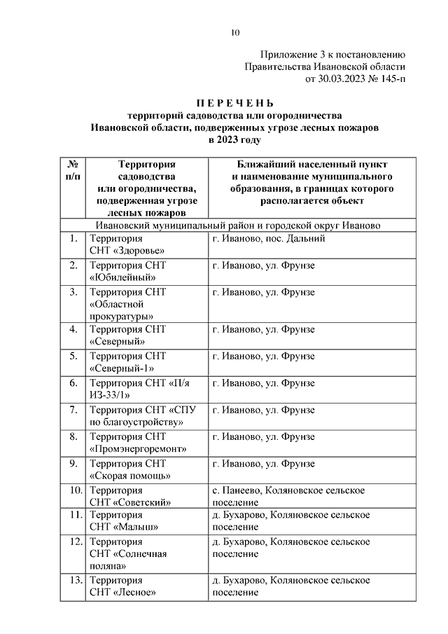 Постановление Правительства Ивановской области от 30.03.2023 N 145-п "Об утверждении перечня населенных пунктов Ивановской области, подверженных угрозе лесных пожаров и других ландшафтных (природных) пожаров в 2023 году, перечней территорий организаций отдыха детей и их оздоровления Ивановской области, территорий садоводства или огородничества Ивановской области, подверженных угрозе лесных пожаров в 2023 году, и начале пожароопасного сезона"