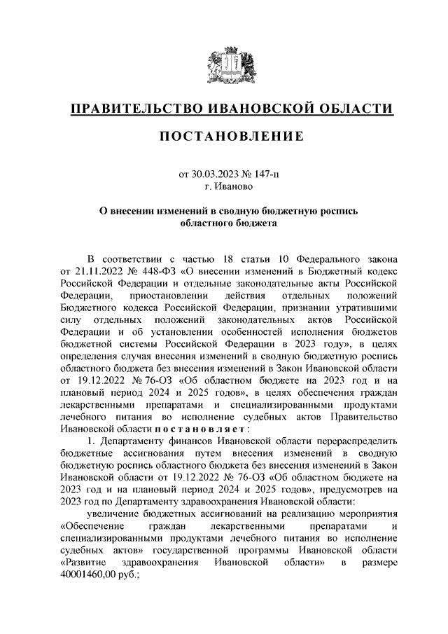 Постановление Правительства Ивановской области от 30.03.2023 N 147-п "О внесении изменений в сводную бюджетную роспись областного бюджета"