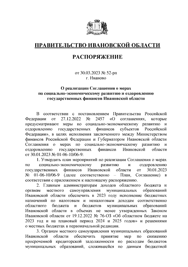 Распоряжение Правительства Ивановской области от 30.03.2023 N 52-рп "О реализации Соглашения о мерах по социально-экономическому развитию и оздоровлению государственных финансов Ивановской области" (вместе с "Планом мероприятий по реализации Соглашения о мерах по социально-экономическому развитию и оздоровлению государственных финансов Ивановской области от 30.01.2023 N 01-06-10/06-9")