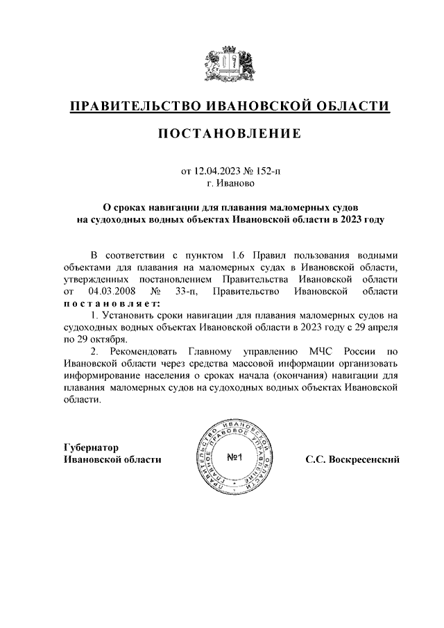 Постановление Правительства Ивановской области от 12.04.2023 N 152-п "О сроках навигации для плавания маломерных судов на судоходных водных объектах Ивановской области в 2023 году"