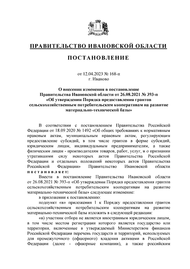 Постановление Правительства Ивановской области от 12.04.2023 N 168-п "О внесении изменения в постановление Правительства Ивановской области от 26.08.2021 N 393-п "Об утверждении Порядка предоставления грантов сельскохозяйственным потребительским кооперативам на развитие материально-технической базы"