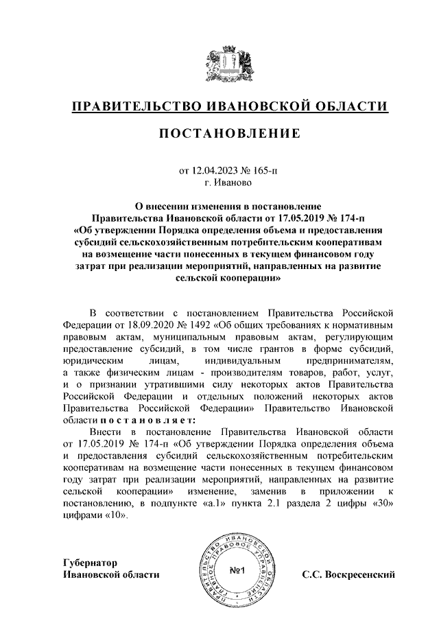 Постановление Правительства Ивановской области от 12.04.2023 N 165-п "О внесении изменения в постановление Правительства Ивановской области от 17.05.2019 N 174-п "Об утверждении Порядка определения объема и предоставления субсидий сельскохозяйственным потребительским кооперативам на возмещение части понесенных в текущем финансовом году затрат при реализации мероприятий, направленных на развитие сельской кооперации"