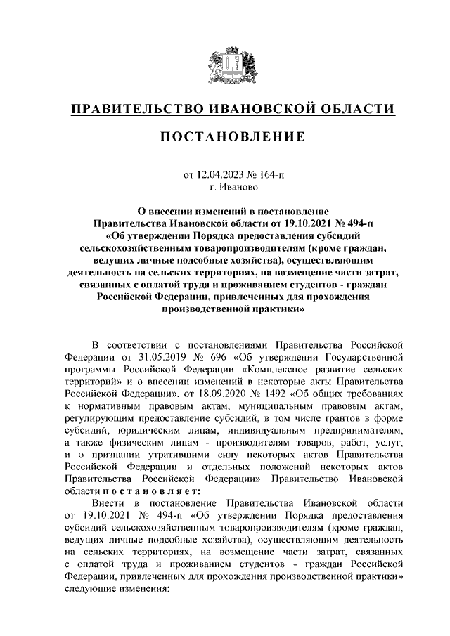 Постановление Правительства Ивановской области от 12.04.2023 N 164-п "О внесении изменений в постановление Правительства Ивановской области от 19.10.2021 N 494-п "Об утверждении Порядка предоставления субсидий сельскохозяйственным товаропроизводителям (кроме граждан, ведущих личные подсобные хозяйства), осуществляющим деятельность на сельских территориях, на возмещение части затрат, связанных с оплатой труда и проживанием студентов - граждан Российской Федерации, привлеченных для прохождения производственной практики"