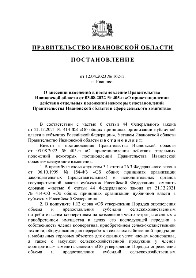 Постановление Правительства Ивановской области от 12.04.2023 N 162-п "О внесении изменений в постановление Правительства Ивановской области от 03.08.2022 N 405-п "О приостановлении действия отдельных положений некоторых постановлений Правительства Ивановской области в сфере сельского хозяйства"