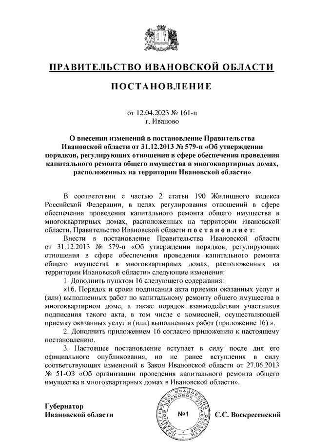 Постановление Правительства Ивановской области от 12.04.2023 N 161-п "О внесении изменений в постановление Правительства Ивановской области от 31.12.2013 N 579-п "Об утверждении порядков, регулирующих отношения в сфере обеспечения проведения капитального ремонта общего имущества в многоквартирных домах, расположенных на территории Ивановской области" (вместе с "Порядком и сроками подписания акта приемки оказанных услуг и (или) выполненных работ по капитальному ремонту общего имущества в многоквартирном доме, а также порядком взаимодействия участников подписания такого акта, в том числе с комиссией, осуществляющей приемку оказанных услуг и (или) выполненных работ")