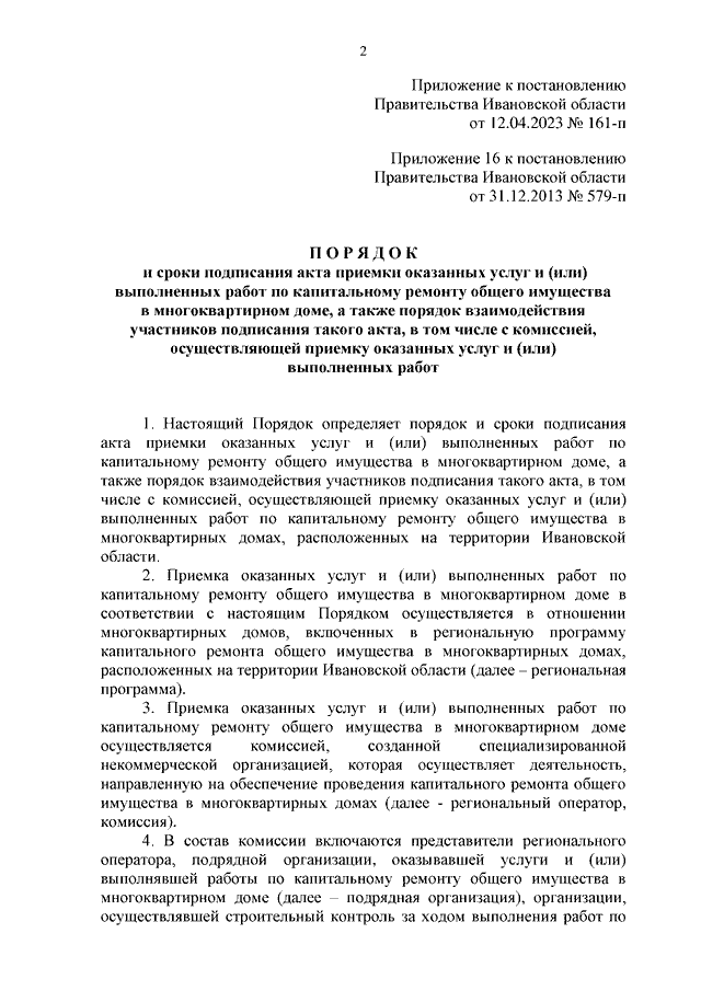 Постановление Правительства Ивановской области от 12.04.2023 N 161-п "О внесении изменений в постановление Правительства Ивановской области от 31.12.2013 N 579-п "Об утверждении порядков, регулирующих отношения в сфере обеспечения проведения капитального ремонта общего имущества в многоквартирных домах, расположенных на территории Ивановской области" (вместе с "Порядком и сроками подписания акта приемки оказанных услуг и (или) выполненных работ по капитальному ремонту общего имущества в многоквартирном доме, а также порядком взаимодействия участников подписания такого акта, в том числе с комиссией, осуществляющей приемку оказанных услуг и (или) выполненных работ")