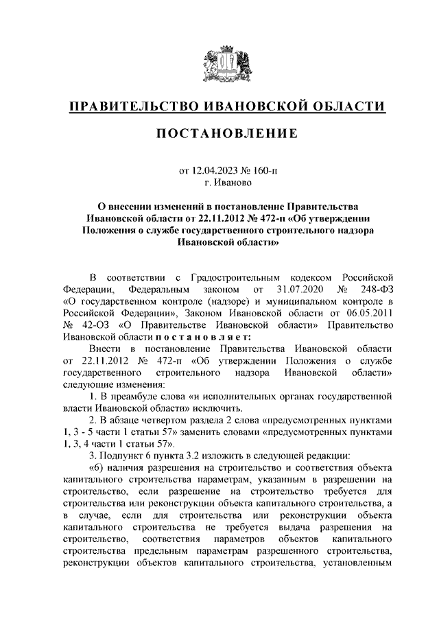 Постановление Правительства Ивановской области от 12.04.2023 N 160-п "О внесении изменений в постановление Правительства Ивановской области от 22.11.2012 N 472-п "Об утверждении Положения о службе государственного строительного надзора Ивановской области"