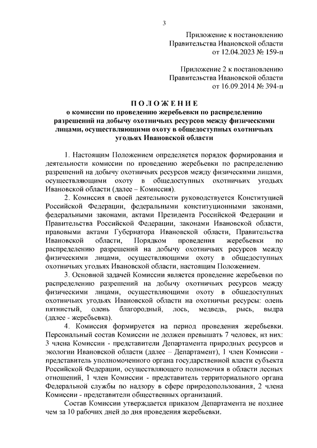 Постановление Правительства Ивановской области от 12.04.2023 N 159-п "О внесении изменений в постановление Правительства Ивановской области от 16.09.2014 N 394-п "О порядке проведения жеребьевки по распределению разрешений на добычу охотничьих ресурсов между физическими лицами, осуществляющими охоту в общедоступных охотничьих угодьях Ивановской области" (вместе с "Положением о комиссии по проведению жеребьевки по распределению разрешений на добычу охотничьих ресурсов между физическими лицами, осуществляющими охоту в общедоступных охотничьих угодьях Ивановской области")