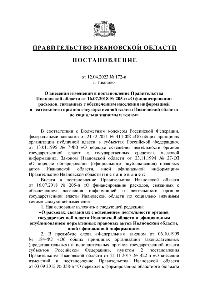 Постановление Правительства Ивановской области от 12.04.2023 N 172-п "О внесении изменений в постановление Правительства Ивановской области от 16.07.2018 N 205-п "О финансировании расходов, связанных с обеспечением населения информацией о деятельности органов государственной власти Ивановской области по социально значимым темам"