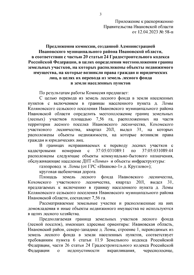 Распоряжение Правительства Ивановской области от 12.04.2023 N 58-рп "Об утверждении предложений комиссии, созданной Администрацией Ивановского муниципального района Ивановской области, в соответствии с частью 20 статьи 24 Градостроительного кодекса Российской Федерации, в целях определения местоположения границ земельных участков, на которых расположены объекты недвижимого имущества, на которые возникли права граждан и юридических лиц, в целях их перевода из земель лесного фонда в земли населенных пунктов"