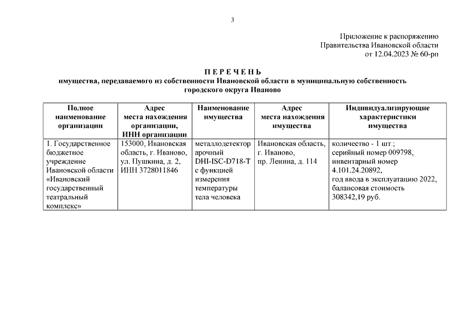 Распоряжение Правительства Ивановской области от 12.04.2023 N 60-рп "О передаче из собственности Ивановской области в муниципальную собственность городского округа Иваново имущества для профилактики коронавирусной инфекции"