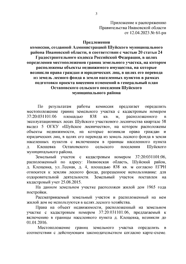 Распоряжение Правительства Ивановской области от 12.04.2023 N 61-рп "Об утверждении предложений комиссии, созданной Администрацией Шуйского муниципального района Ивановской области, в соответствии с частью 20 статьи 24 Градостроительного кодекса Российской Федерации, в целях определения местоположения границ земельного участка, на котором расположены объекты недвижимого имущества, на которые возникли права граждан и юридических лиц, в целях его перевода из земель лесного фонда в земли населенных пунктов в рамках подготовки проекта внесения изменений в генеральный план Остаповского сельского поселения Шуйского муниципального района"