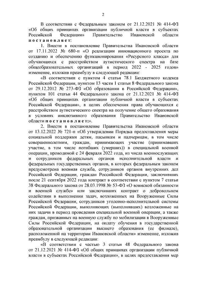 Постановление Правительства Ивановской области от 19.04.2023 N 177-п "О внесении изменений в постановления Правительства Ивановской области от 17.11.2022 N 680-п "О реализации инновационного проекта по созданию и обеспечению функционирования "Ресурсного класса" для обучающихся с расстройством аутистического спектра на базе муниципальных общеобразовательных организаций в период 2022 - 2025 годов", от 13.12.2022 N 721-п "Об утверждении Порядка предоставления меры социальной поддержки детям, пасынкам и падчерицам, в том числе совершеннолетним, граждан, принимающих участие (принимавших участие, в том числе погибших (умерших)) в специальной военной операции, проводимой с 24 февраля 2022 года, из числа военнослужащих и сотрудников федеральных органов исполнительной власти и федеральных государственных органов, в которых федеральным законом предусмотрена военная служба, сотрудников органов внутренних дел Российской Федерации, граждан Российской Федерации, заключивших после 21 сентября 2022 года контракт в соответствии с пунктом 7 статьи 38 Федерального закона от 28.03.1998 N 53-ФЗ "О воинской обязанности и военной службе" или заключивших контракт о добровольном содействии в выполнении задач, возложенных на Вооруженные Силы Российской Федерации, сотрудников уголовно-исполнительной системы Российской Федерации, выполняющих (выполнявших) возложенные на них задачи в период проведения специальной военной операции, а также граждан, призванных на военную службу по мобилизации в Вооруженные Силы Российской Федерации, на оплату обучения в государственной образовательной организации высшего образования (ее филиале), расположенной на территории Ивановской области"