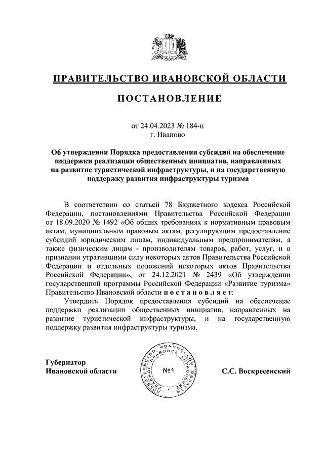 Постановление Правительства Ивановской области от 24.04.2023 N 184-п "Об утверждении Порядка предоставления субсидий на обеспечение поддержки реализации общественных инициатив, направленных на развитие туристической инфраструктуры, и на государственную поддержку развития инфраструктуры туризма"