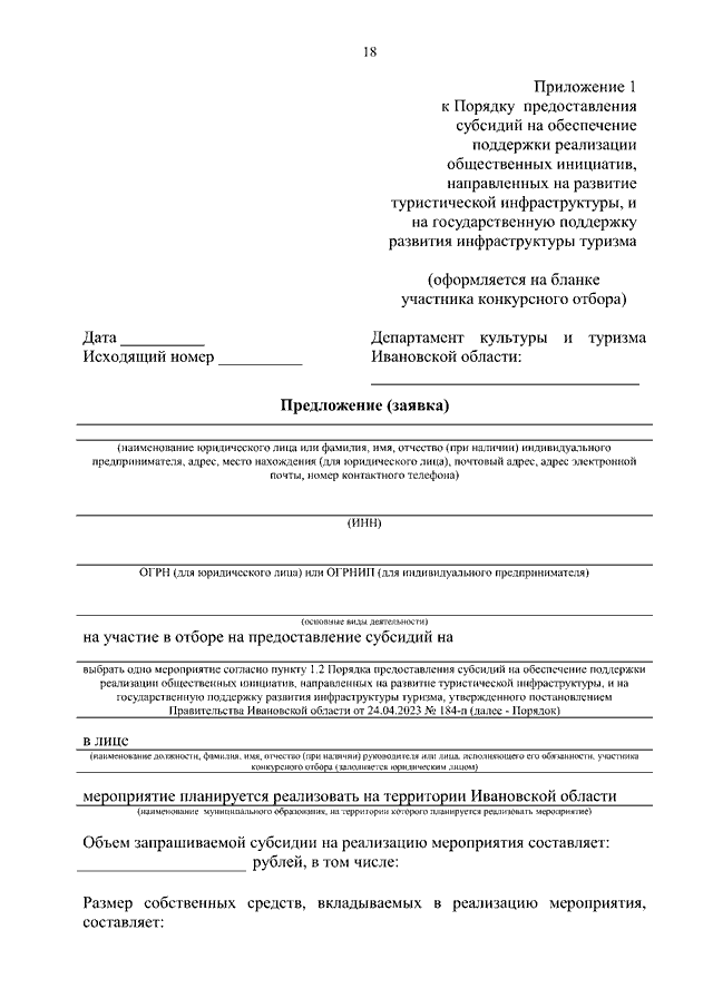 Постановление Правительства Ивановской области от 24.04.2023 N 184-п "Об утверждении Порядка предоставления субсидий на обеспечение поддержки реализации общественных инициатив, направленных на развитие туристической инфраструктуры, и на государственную поддержку развития инфраструктуры туризма"