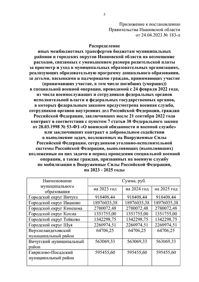 Постановление Правительства Ивановской области от 24.04.2023 N 183-п "Об утверждении распределения иных межбюджетных трансфертов бюджетам муниципальных районов и городских округов Ивановской области на возмещение расходов, связанных с уменьшением размера родительской платы за присмотр и уход в муниципальных образовательных организациях, реализующих образовательную программу дошкольного образования, за детьми, пасынками и падчерицами граждан, принимающих участие (принимавших участие, в том числе погибших (умерших)) в специальной военной операции, проводимой с 24 февраля 2022 года, из числа военнослужащих и сотрудников федеральных органов исполнительной власти и федеральных государственных органов, в которых федеральным законом предусмотрена военная служба, сотрудников органов внутренних дел Российской Федерации, граждан Российской Федерации, заключивших после 21 сентября 2022 года контракт в соответствии с пунктом 7 статьи 38 Федерального закона от 28.03.1998 N 53-ФЗ "О воинской обязанности и военной службе" или заключивших контракт о добровольном содействии в выполнении задач, возложенных на Вооруженные Силы Российской Федерации, сотрудников уголовно-исполнительной системы Российской Федерации, выполняющих (выполнявших) возложенные на них задачи в период проведения специальной военной операции, а также граждан, призванных на военную службу по мобилизации в Вооруженные Силы Российской Федерации, на 2023 - 2025 годы"