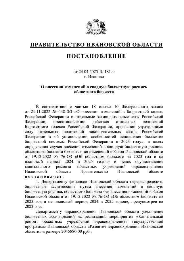 Постановление Правительства Ивановской области от 24.04.2023 N 181-п "О внесении изменений в сводную бюджетную роспись областного бюджета"