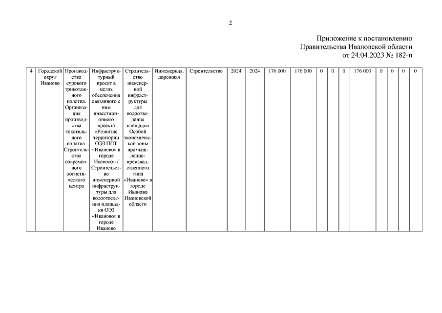 Постановление Правительства Ивановской области от 24.04.2023 N 182-п "О внесении изменения в постановление Правительства Ивановской области от 27.12.2021 N 697-п "Об утверждении детализированного перечня мероприятий, реализуемых в рамках инфраструктурных проектов, на финансовое обеспечение которых из федерального бюджета предоставляется бюджетный кредит"
