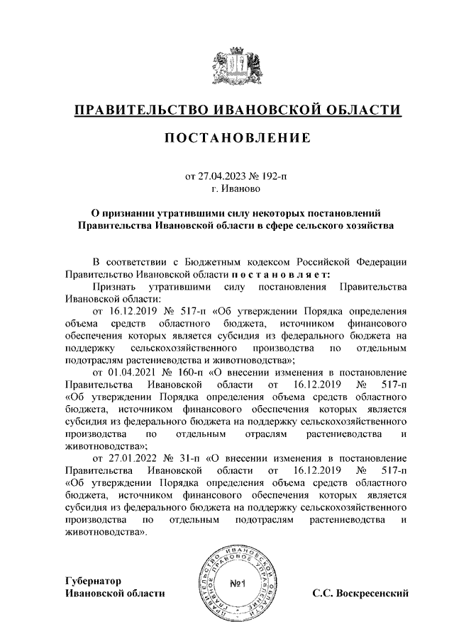 Постановление Правительства Ивановской области от 27.04.2023 N 192-п "О признании утратившими силу некоторых постановлений Правительства Ивановской области в сфере сельского хозяйства"