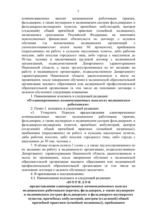 Постановление Правительства Ивановской области от 27.04.2023 N 191-п "О внесении изменений в постановление Правительства Ивановской области от 22.08.2018 N 255-п "О предоставлении единовременных компенсационных выплат медицинским работникам (врачам, фельдшерам, а также акушеркам и медицинским сестрам фельдшерских и фельдшерско-акушерских пунктов, врачебных амбулаторий, центров (отделений) общей врачебной практики (семейной медицины)), являющимся гражданами Российской Федерации, не имеющим неисполненных финансовых обязательств по договору о целевом обучении (за исключением медицинских организаций с укомплектованностью штата менее 60 процентов), прибывшим (переехавшим) на работу в сельские населенные пункты, либо рабочие поселки, либо поселки городского типа, либо города с населением до 50 тыс. человек и заключившим трудовой договор с медицинской организацией, подведомственной Департаменту здравоохранения Ивановской области, а также трудоустроившимся по их желанию на работу в медицинскую организацию, подведомственную Департаменту здравоохранения Ивановской области, расположенную в месте их проживания, после завершения обучения в медицинской образовательной организации высшего образования или медицинской профессиональной образовательной организации (в том числе на основании договора о целевом обучении)"