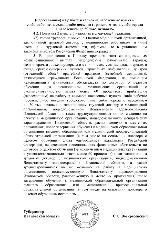 Постановление Правительства Ивановской области от 27.04.2023 N 191-п "О внесении изменений в постановление Правительства Ивановской области от 22.08.2018 N 255-п "О предоставлении единовременных компенсационных выплат медицинским работникам (врачам, фельдшерам, а также акушеркам и медицинским сестрам фельдшерских и фельдшерско-акушерских пунктов, врачебных амбулаторий, центров (отделений) общей врачебной практики (семейной медицины)), являющимся гражданами Российской Федерации, не имеющим неисполненных финансовых обязательств по договору о целевом обучении (за исключением медицинских организаций с укомплектованностью штата менее 60 процентов), прибывшим (переехавшим) на работу в сельские населенные пункты, либо рабочие поселки, либо поселки городского типа, либо города с населением до 50 тыс. человек и заключившим трудовой договор с медицинской организацией, подведомственной Департаменту здравоохранения Ивановской области, а также трудоустроившимся по их желанию на работу в медицинскую организацию, подведомственную Департаменту здравоохранения Ивановской области, расположенную в месте их проживания, после завершения обучения в медицинской образовательной организации высшего образования или медицинской профессиональной образовательной организации (в том числе на основании договора о целевом обучении)"