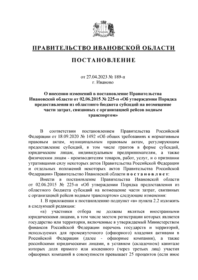 Постановление Правительства Ивановской области от 27.04.2023 N 189-п "О внесении изменений в постановление Правительства Ивановской области от 02.06.2015 N 225-п "Об утверждении Порядка предоставления из областного бюджета субсидий на возмещение части затрат, связанных с организацией рейсов водным транспортом"