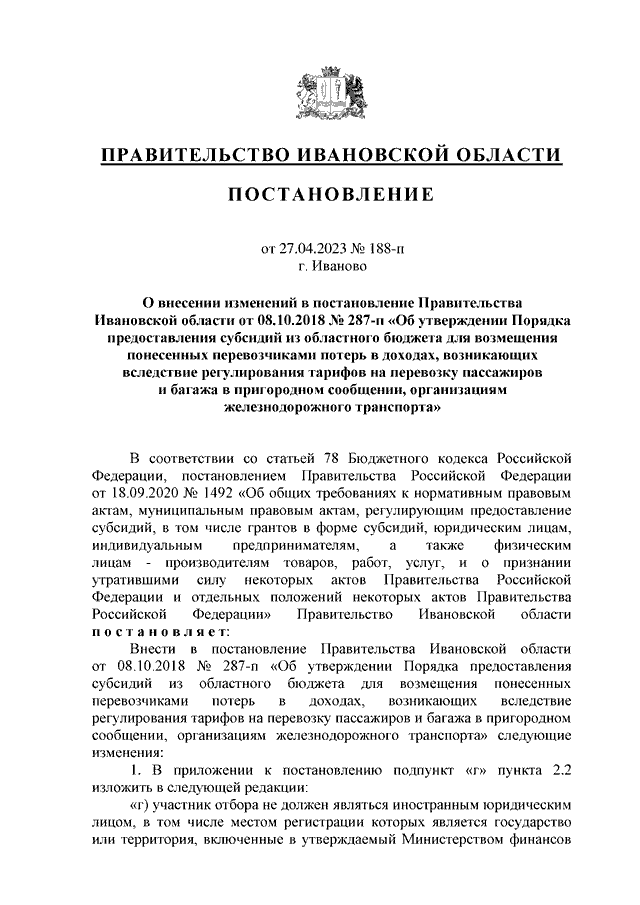 Постановление Правительства Ивановской области от 27.04.2023 N 188-п "О внесении изменений в постановление Правительства Ивановской области от 08.10.2018 N 287-п "Об утверждении Порядка предоставления субсидий из областного бюджета для возмещения понесенных перевозчиками потерь в доходах, возникающих вследствие регулирования тарифов на перевозку пассажиров и багажа в пригородном сообщении, организациям железнодорожного транспорта"