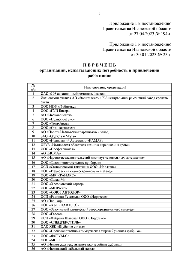 Постановление Правительства Ивановской области от 27.04.2023 N 194-п "О внесении изменений в постановление Правительства Ивановской области от 30.01.2023 N 23-п "Об утверждении перечня организаций, испытывающих потребность в привлечении работников, и перечня востребованных профессий (должностей, специальностей)"