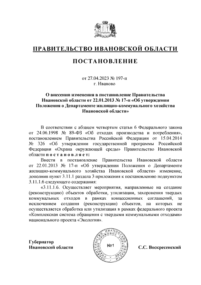 Постановление Правительства Ивановской области от 27.04.2023 N 197-п "О внесении изменения в постановление Правительства Ивановской области от 22.01.2013 N 17-п "Об утверждении Положения о Департаменте жилищно-коммунального хозяйства Ивановской области"
