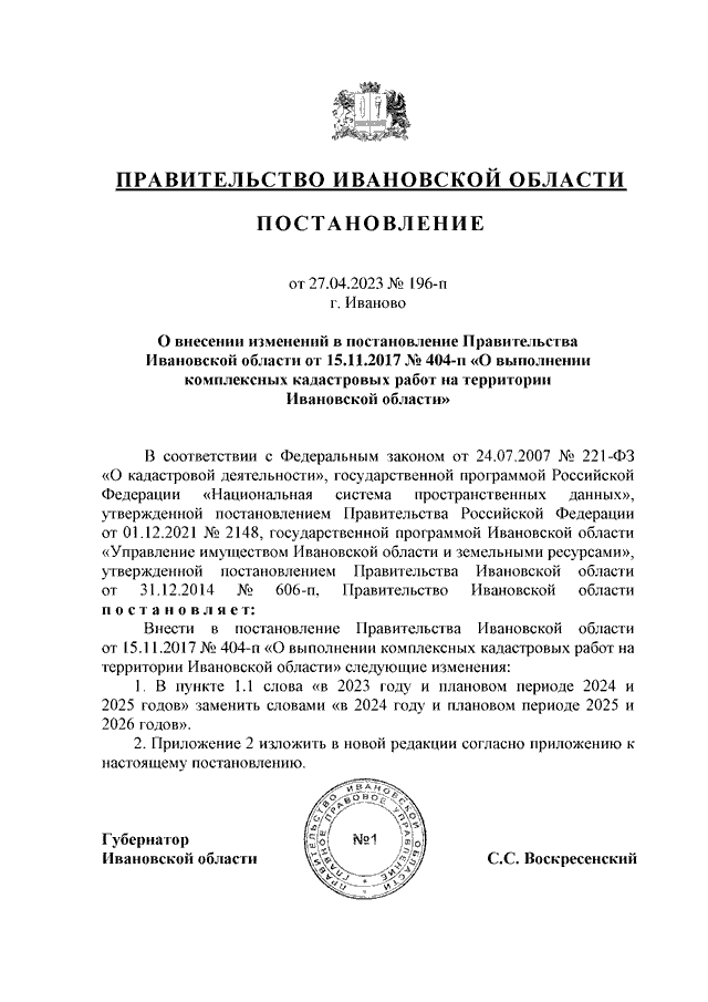 Постановление Правительства Ивановской области от 27.04.2023 N 196-п "О внесении изменений в постановление Правительства Ивановской области от 15.11.2017 N 404-п "О выполнении комплексных кадастровых работ на территории Ивановской области" (вместе с "Перечнем кадастровых кварталов, в границах которых предполагается проведение комплексных кадастровых работ на территории Ивановской области")