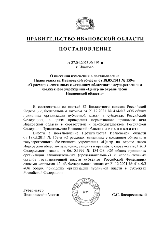 Постановление Правительства Ивановской области от 27.04.2023 N 195-п "О внесении изменения в постановление Правительства Ивановской области от 18.05.2011 N 159-п "О расходах, связанных с созданием областного государственного бюджетного учреждения "Центр по охране лесов Ивановской области"