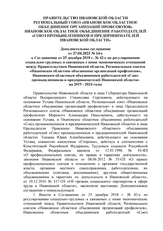 "Дополнительное соглашение к Соглашению от 25.12.2018 N 42-с по регулированию социально-трудовых и связанных с ними экономических отношений между Правительством Ивановской области, Региональным союзом "Ивановское областное объединение организаций профсоюзов", Ивановским областным объединением работодателей "Союз промышленников и предпринимателей Ивановской области" на 2019 - 2024 годы"