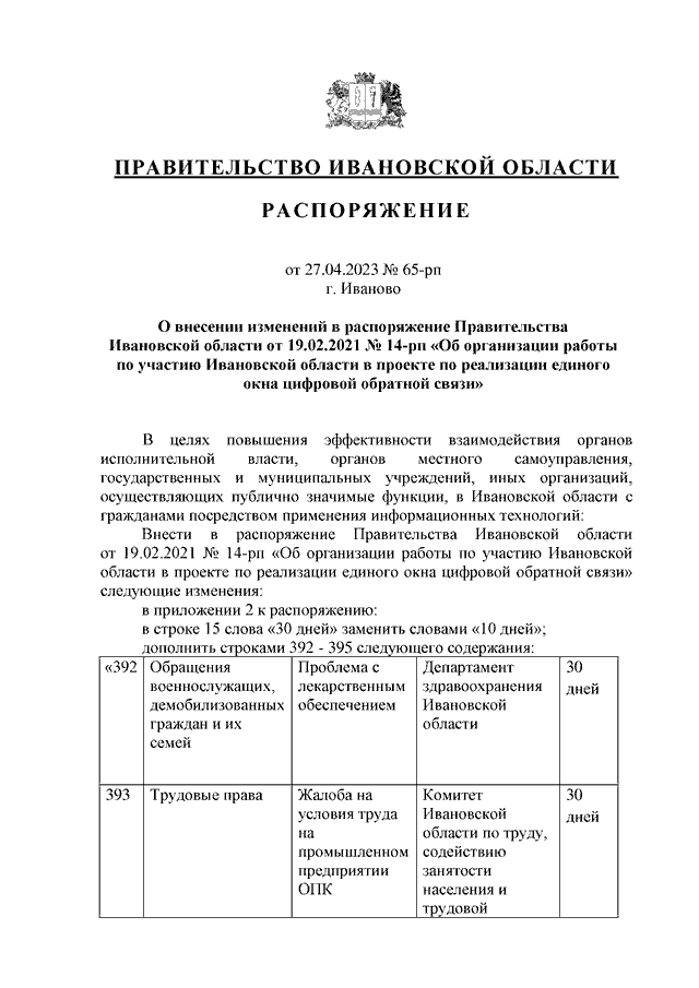 Распоряжение Правительства Ивановской области от 27.04.2023 N 65-рп "О внесении изменений в распоряжение Правительства Ивановской области от 19.02.2021 N 14-рп "Об организации работы по участию Ивановской области в проекте по реализации единого окна цифровой обратной связи"