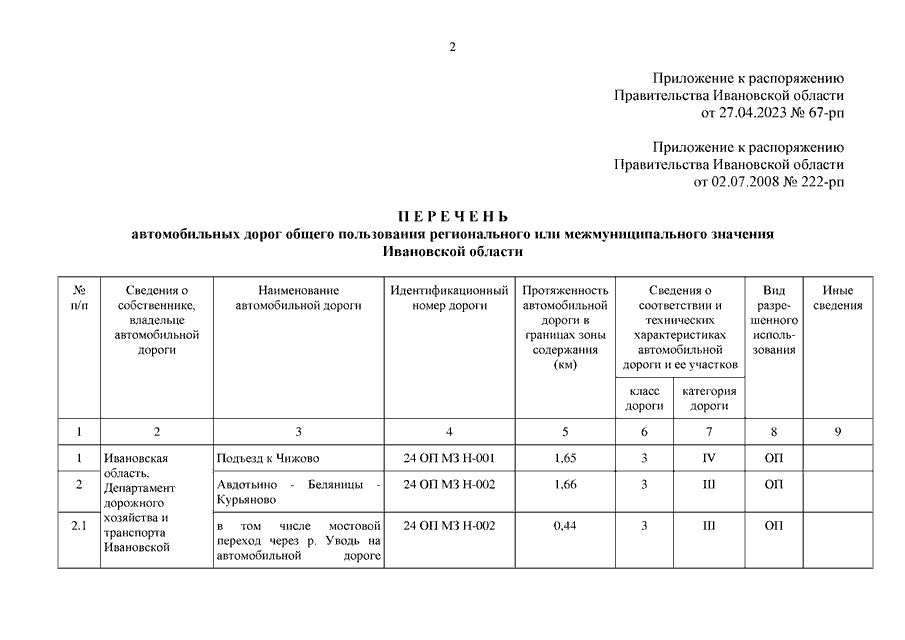 Распоряжение Правительства Ивановской области от 27.04.2023 N 67-рп "О внесении изменения в распоряжение Правительства Ивановской области от 02.07.2008 N 222-рп "Об утверждении перечня автомобильных дорог общего пользования регионального или межмуниципального значения Ивановской области"