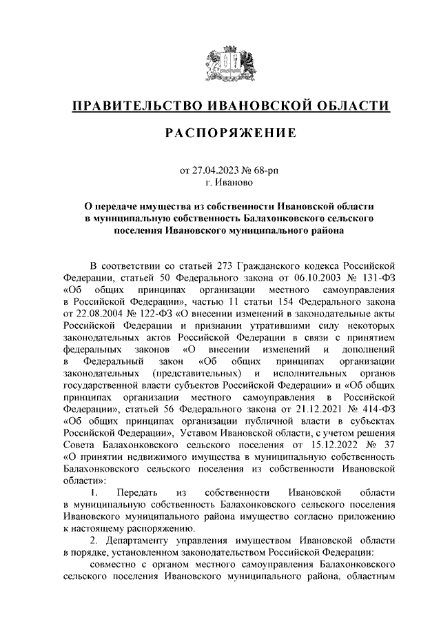 Распоряжение Правительства Ивановской области от 27.04.2023 N 68-рп "О передаче имущества из собственности Ивановской области в муниципальную собственность Балахонковского сельского поселения Ивановского муниципального района"