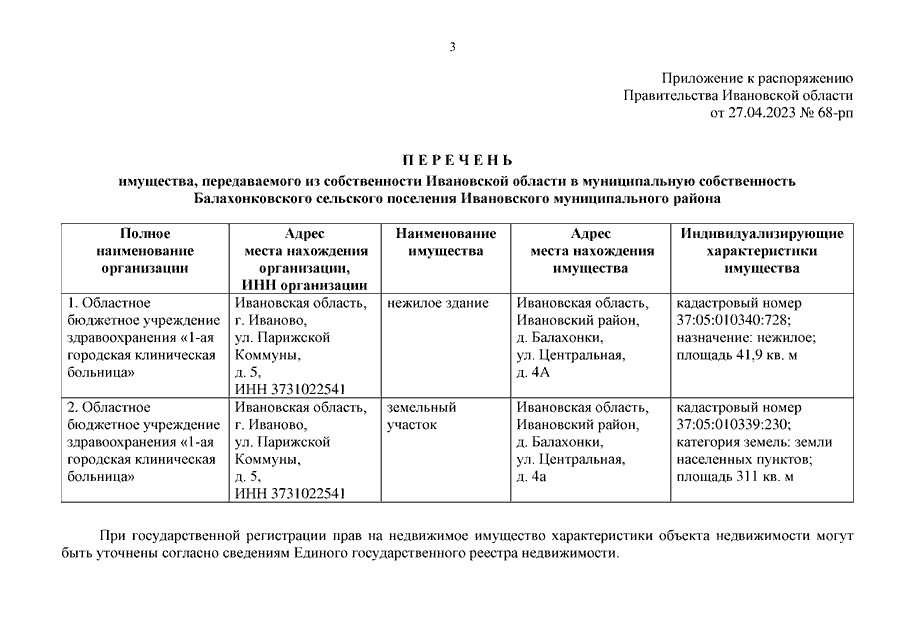 Распоряжение Правительства Ивановской области от 27.04.2023 N 68-рп "О передаче имущества из собственности Ивановской области в муниципальную собственность Балахонковского сельского поселения Ивановского муниципального района"