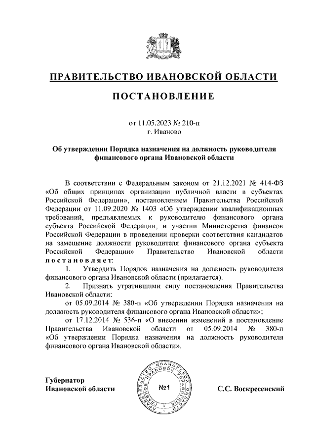 Постановление Правительства Ивановской области от 11.05.2023 N 210-п "Об утверждении Порядка назначения на должность руководителя финансового органа Ивановской области"