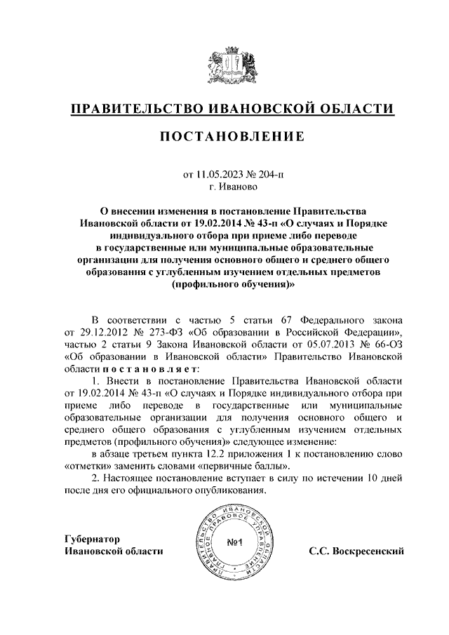 Постановление Правительства Ивановской области от 11.05.2023 N 204-п "О внесении изменения в постановление Правительства Ивановской области от 19.02.2014 N 43-п "О случаях и Порядке индивидуального отбора при приеме либо переводе в государственные или муниципальные образовательные организации для получения основного общего и среднего общего образования с углубленным изучением отдельных предметов (профильного обучения)"